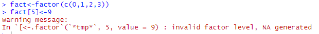 fact<-factor(c(0,1,2,3)) fact[5]<-9 |