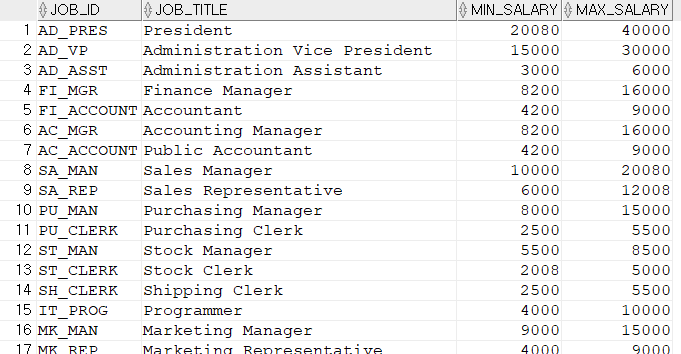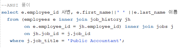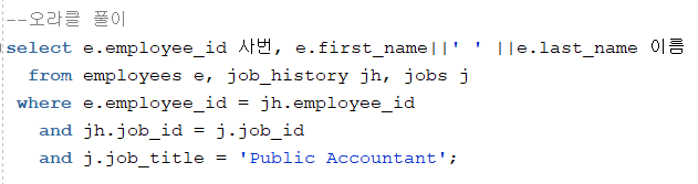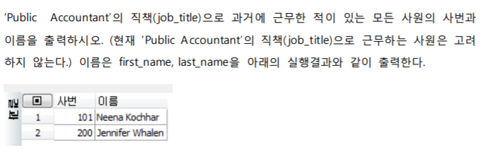 2. 직책(job_title)이 'Public Account'이다 -> JOB_HISTORY 테이블과 JOBS 테이블 조인 + 조건